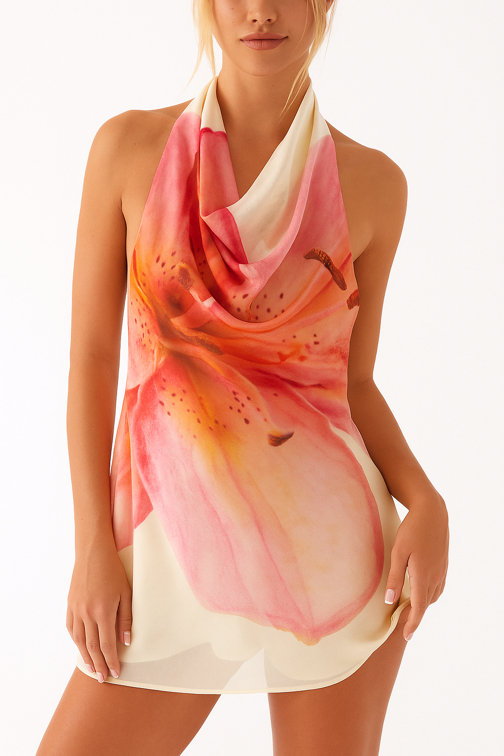 Bring a touch of summer elegance to your wardrobe with this floral halter mini dress. Featuring a draped neckline and open back, it combines effortless charm with a flirty silhouette. The lightweight fabric and vibrant print make it perfect for beach days, vacations, or warm-weather outings.